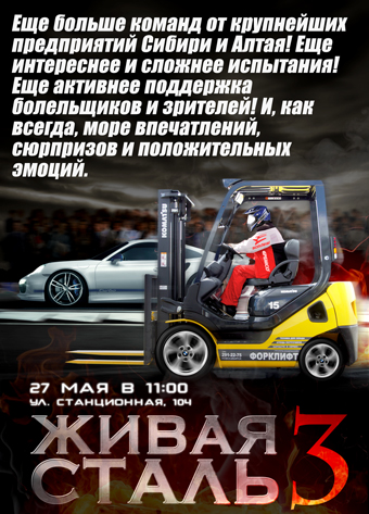 Дорогие друзья! Спешим вам сообщить, что 27 мая 2015 года на площадке «Экспоцентра» состоится третий ежегодный фестиваль мастерства операторов погрузчиков KOMATSU «Живая Сталь-3»