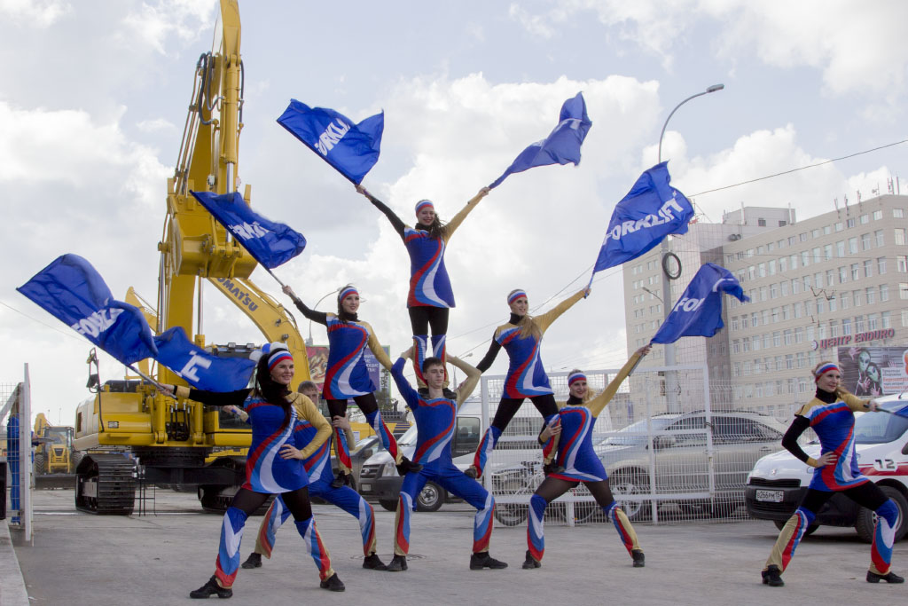 Красивые девчонки и мальчишки с флагами, под громкую музыку открыли процедуру передачи супер-экскаватора KOMATSU PC300-8М0. Холодный ветер развевает флаги, а от улыбок девушек становится тепло.