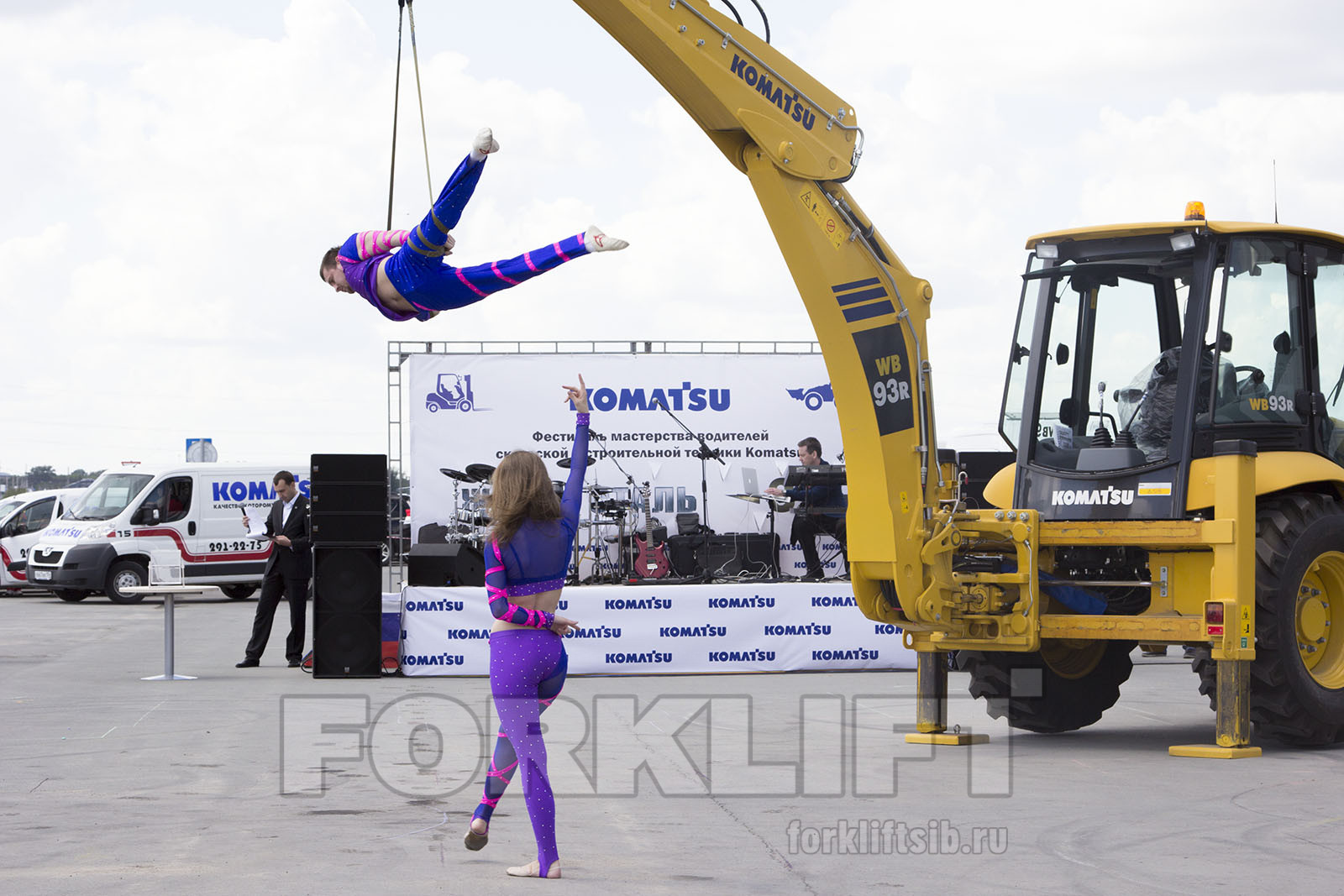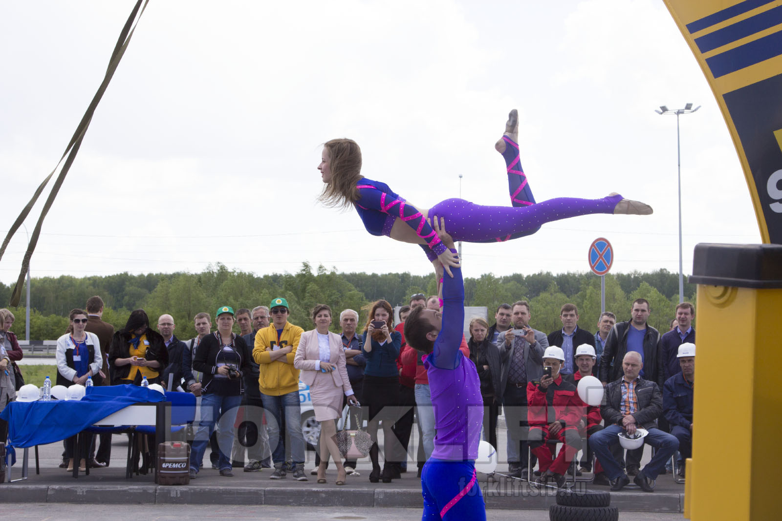 Было очень любопытно всем посмотреть, как воздушные гимнасты из юного дуэта «Duo Denira» исполняют акробатические трюки в воздухе на ремнях, привязанных к ковшу экскаватора-погрузчика и как с помощью вил автопогрузчика расставляют цветы по полочкам, составляют башню из поддонов и конусов или с помощью экскаватора-погрузчика забрасываю мячи в бочку. Болельщики с замиранием сердца смотрели как можно ковшом снять кепку с вешалки. Но участников сложность и оригинальность заданий только раззадоривала, они четко выполняли все манипуляции вилами и ковшом.